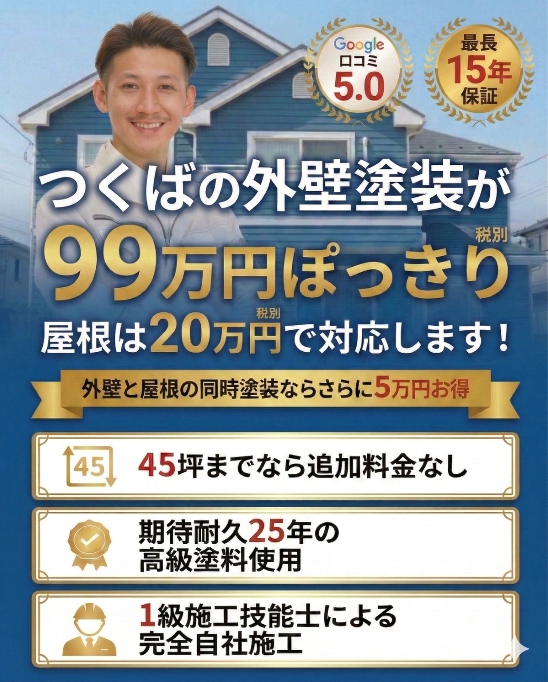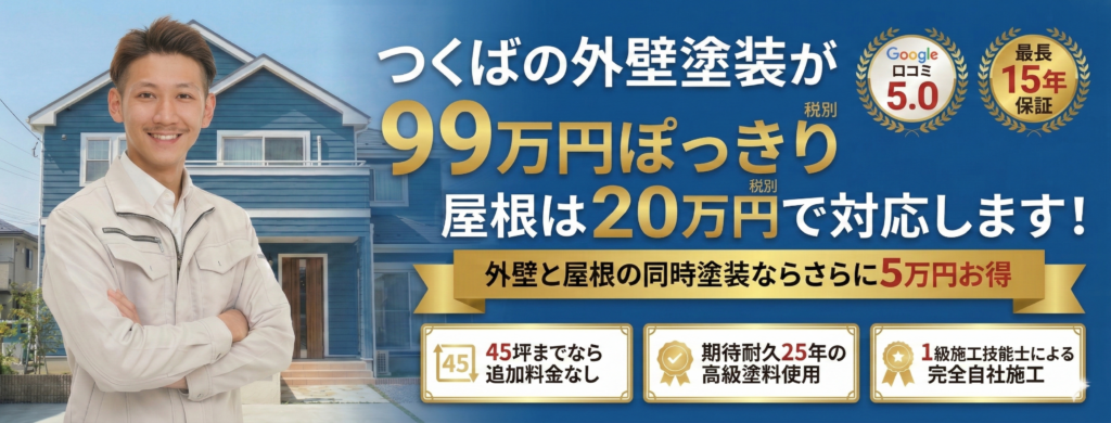 当社は、曖昧な「〇〇万円〜」という表記はいたしません。45坪までなら、最高級の遮熱無機フッ素塗料を使ってもこの価格です。