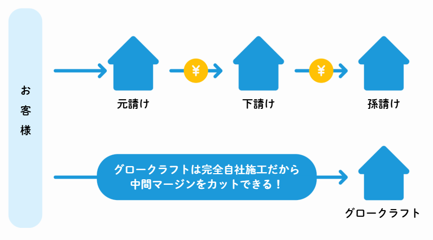 グロークラフトは、代表の丸山がお客様と直接契約し、自社職人が施工します。余分な中間マージンを一切カットし、その分を品質を落とすことなくお客様に還元しているため、平均20万円のコストダウンを実現しています。